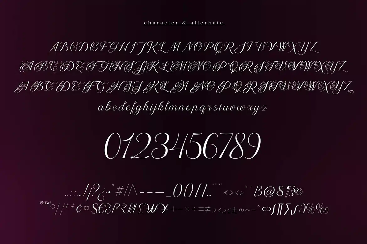 With its diverse character collection, Altheria provides numerous options to add a personal touch to your design works. The ability to choose from different letter variations grants unlimited flexibility and creativity, making it perfect for crafting attractive and distinctive visuals.