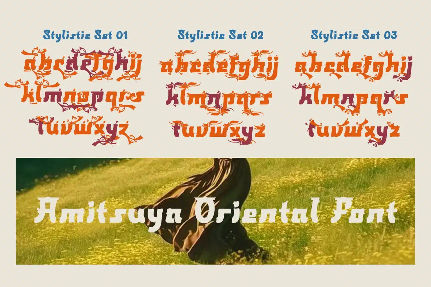 Introducing Amitsuya, the font shown in the image is a typographic design inspired by Japanese visual style. This can be seen from the letterforms that feature decorative ornaments, artistic curves, and detailed elements that resemble aspects of Japanese art. Designs like this often take inspiration from the characteristics of Japanese aesthetics, which emphasize the beauty of lines, balance of form, and distinctive decorative details. Although the font uses the Latin alphabet, its visual appearance is designed to create a strong Japanese atmosphere that is easily recognizable.