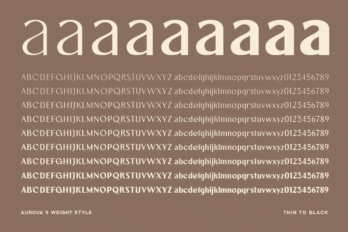 Aurova Font is a display sans serif font family with elegant touch on it, that blends timeless sophistication with modern clarity. It delivers a professional and versatile look suitable for a wide range of design purposes. Featuring 9 styles, from Thin to Black, Aurova font offers full typographic flexibility, ideal for both body text and bold headlines.