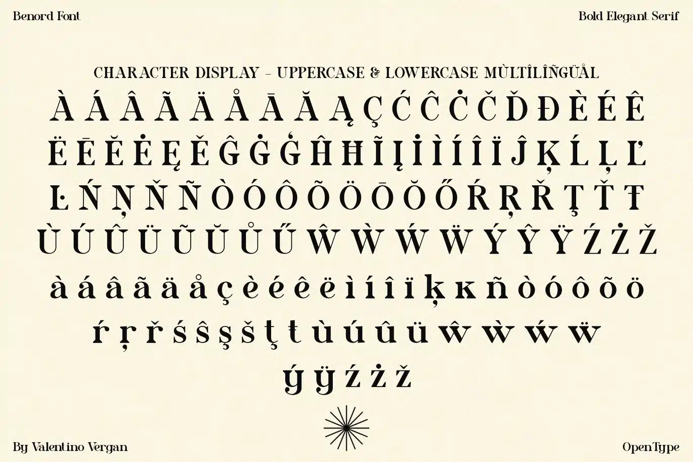 Benord is a bold elegant modern serif, it comes with stylistic alternates and creative ligatures. The idea behind Benord was to modernise an old style serif for today’s design industry. The main aim was too creative a serif take has a nostalgic vintage feel with a modern twist. Benord is an ideal font for graphic designs and advertising agencies who are looking to create beautiful logos and designs. Benord was designed to look great in both large and small type settings, making it perfect for cover and layouts. With its great multilingual support, Benord can produce a large number of different languages.
