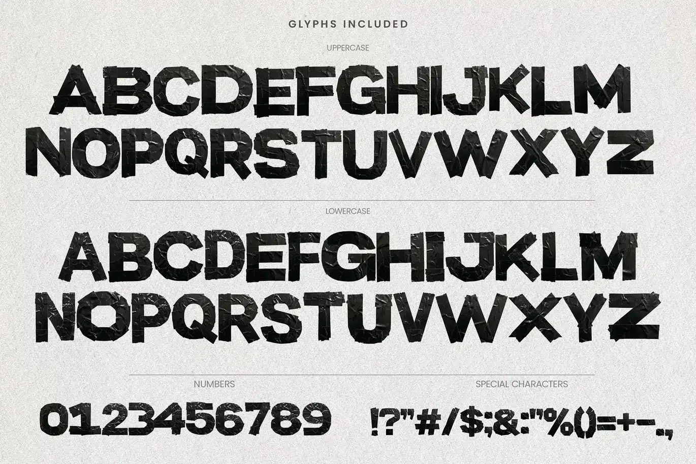 Meticulously crafted from high-resolution scans of actual black electrical tape, every letter captures the unique texture of the material. You get the crinkles, the jagged torn edges, the glossy reflections, and the erratic layering.