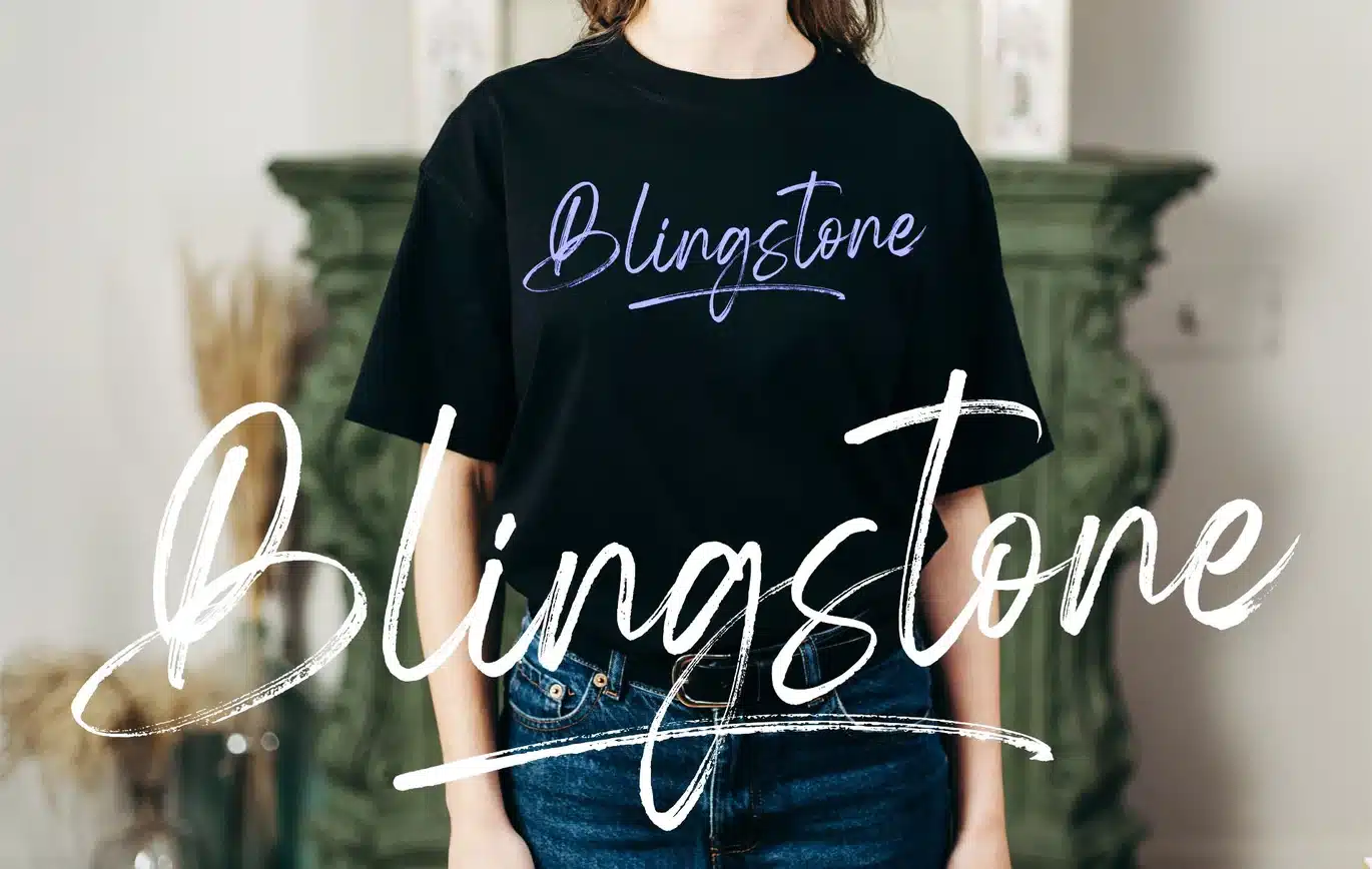 Say hello to Blingstone A font that you were meant to find, and is now destined to be with you :) An elegant Script, Blingstone is a lovingly handwritten brush script , with an air of grace and flamboyancy.