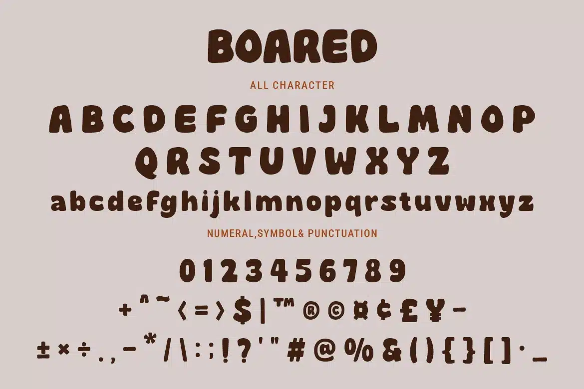 Boared is a hand drawn display font with organic shapes and a friendly personality. Ideal for food branding, bakery packaging, posters, and creative projects that need a warm handmade feel.