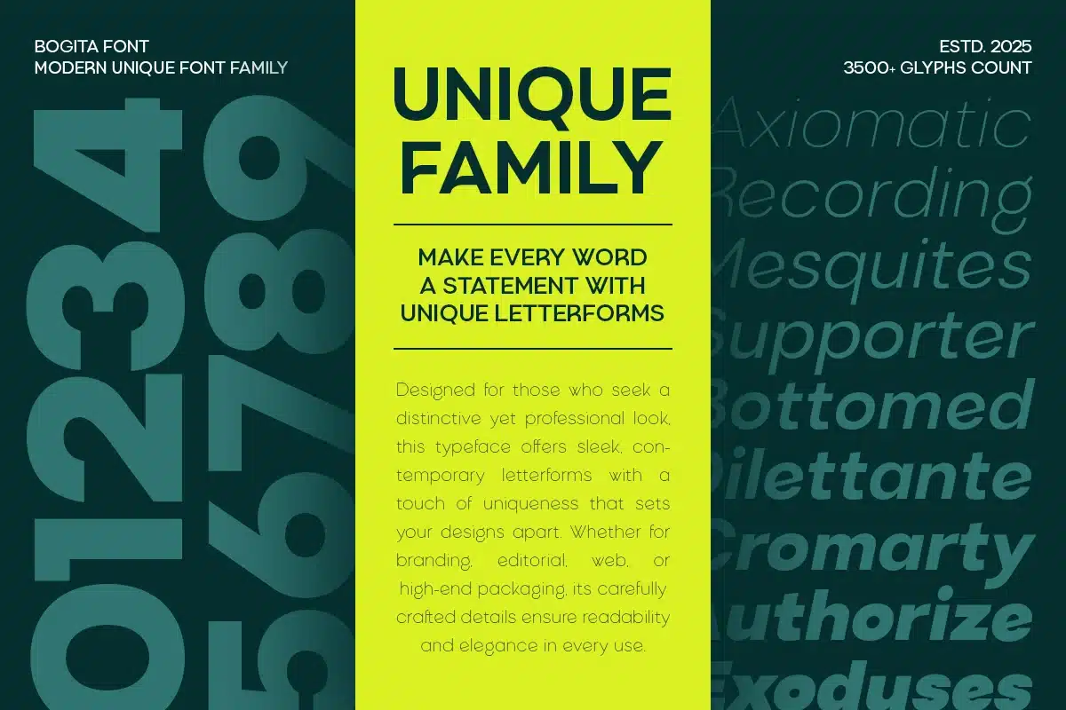 Bogita – Modern Logo Font Family is a versatile contemporary typeface family created to support modern branding with flexibility and consistency. Inspired by clean logo systems, modern typography trends, and scalable brand identities, Bogita is designed for designers who need a reliable font family that works across multiple branding needs.