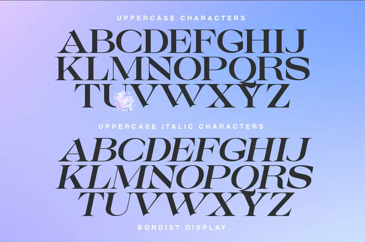 Bondist Display comes with a wide range of OpenType -features. Keep Standard Ligatures on in normal use. Try Discretionary Ligatures, Swash, Stylistic or Titling Alternates for custom headlines or logos.