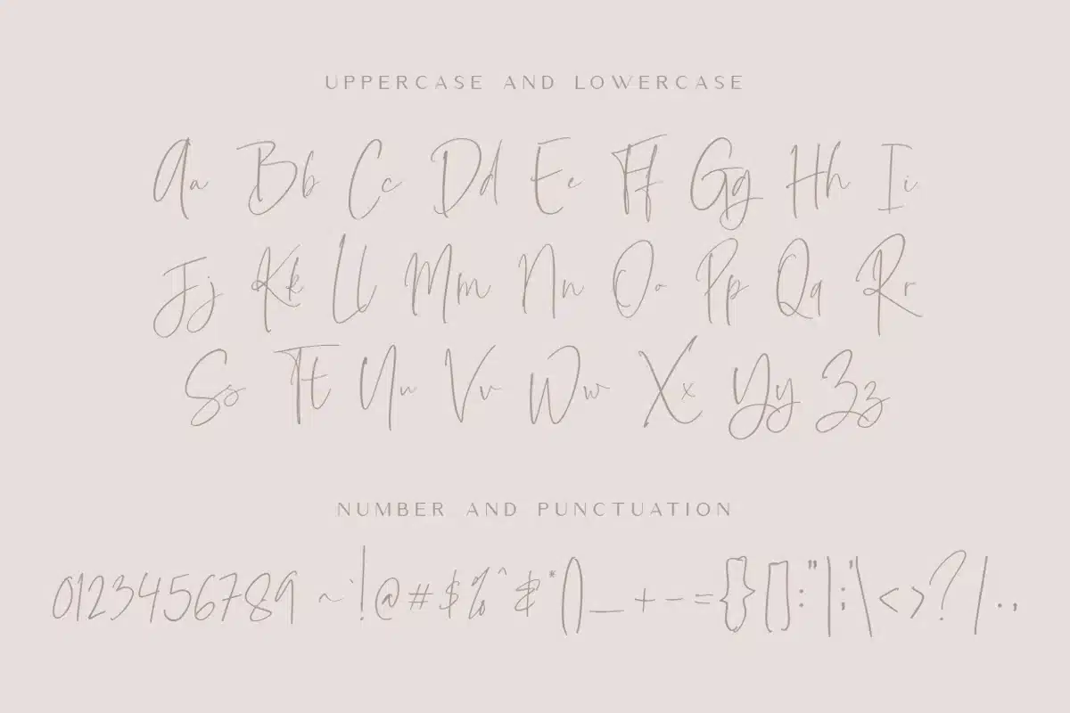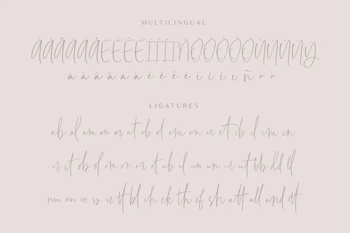 It includes a full set of elegant uppercase and lowercase letters, multilingual symbols, numerals, and punctuation. The font has a smooth wet ink texture, so would be perfect for all types of printing techniques such as embroidery, laser cutting, gold foil, etc.