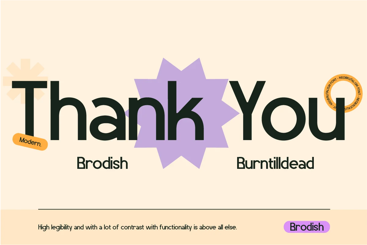 Introducing, Brodish, our neo brutalis font. Its bold, geometric shapes and industrial feel make it perfect for edgy design. This font is designed to be both easy to read and visually striking, thanks to its simple, minimalist style and unique characteristics include the multilingual. Also this font Perfect for creating eye-catching headlines and titles. Ideal for headlines, posters, magazine and branding project.