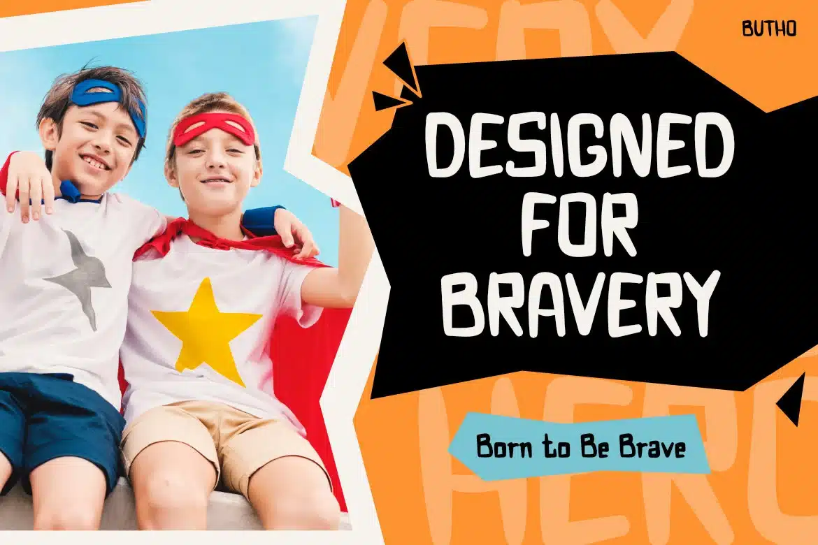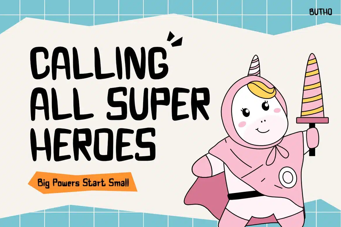BUTHO is a bold kids display typeface built for superhero-themed visuals and playful storytelling, combining chunky letterforms, firm strokes, and slightly irregular proportions that bring action and character to every word. Its vibe is strong, playful, and energetic, perfectly aligned with kids entertainment, comic-style branding, and imaginative campaigns. The rounded yet sturdy structure keeps the letters friendly while maintaining a confident presence that reads clearly at large sizes.
