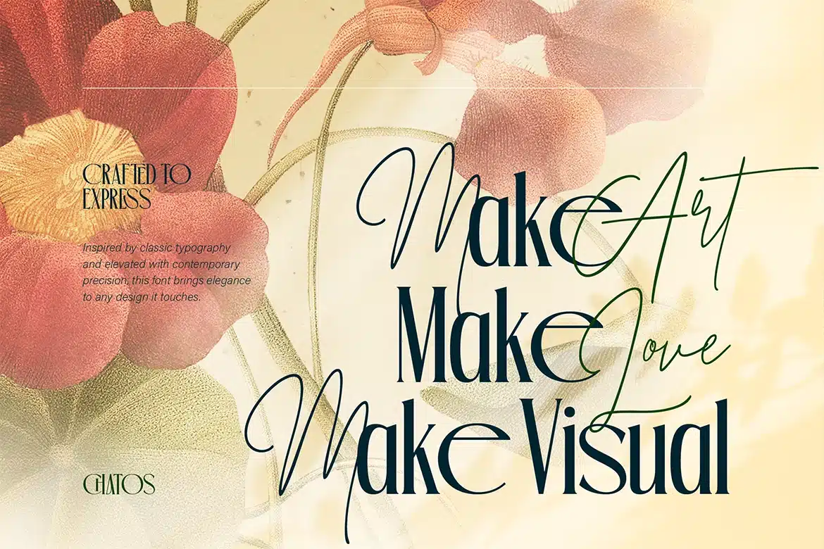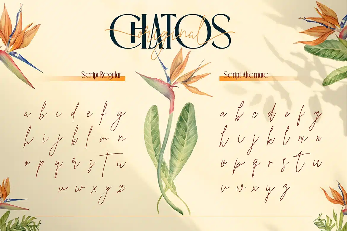 With ligatures and OpenType features, Chatos Original allows you to create smooth typography compositions that look premium and well-crafted. This font is inspired by classic elegance with a modern floral aesthetic.