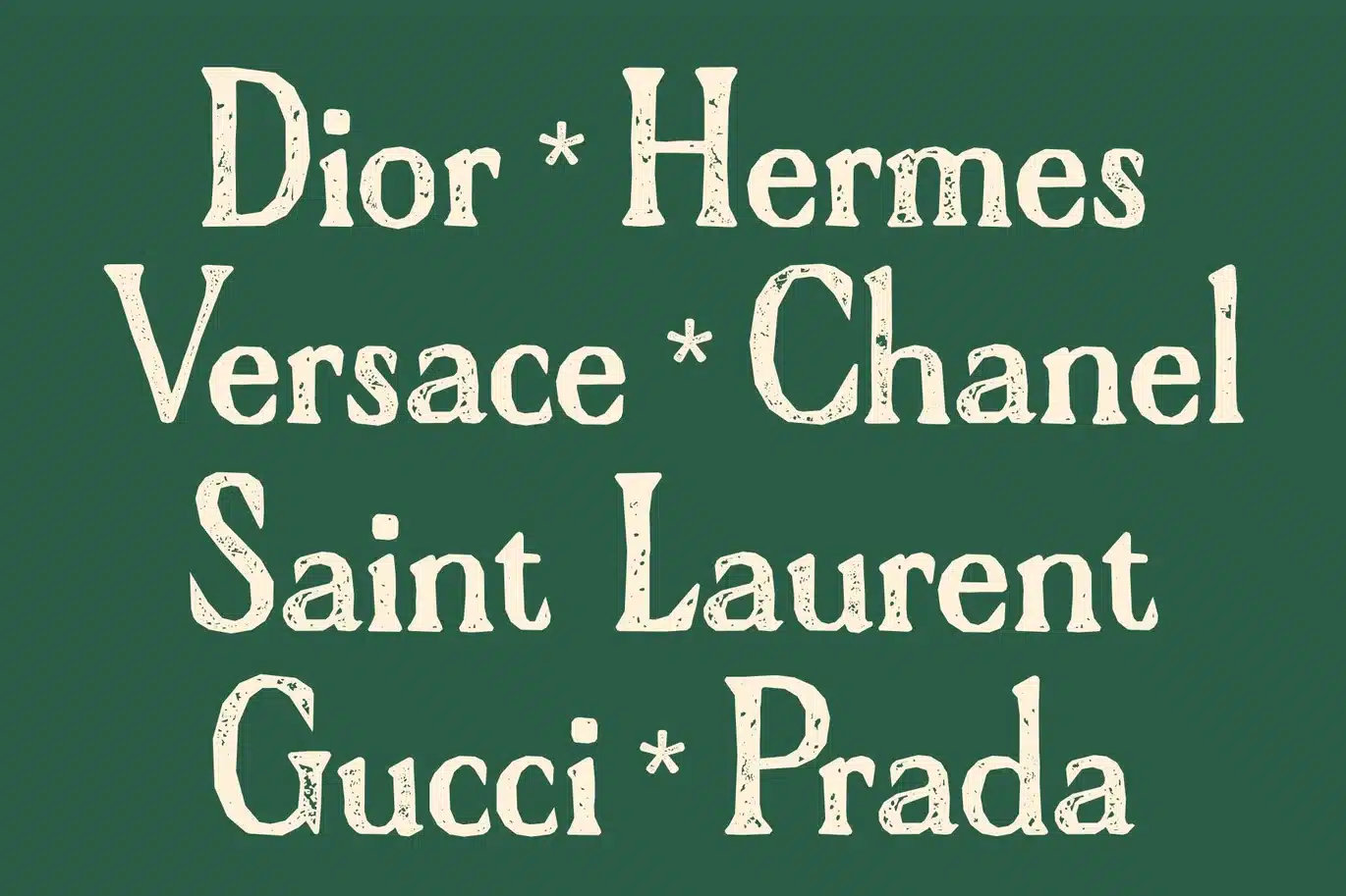 This font balances modern precision with classic serif elegance. Its clean lines, balanced spacing, and subtle decorative details create a polished look that communicates authority and confidence. The vintage stamp texture enriches the design, giving it depth and visual interest without overwhelming its professional appearance.