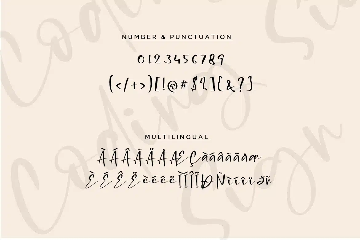 Coding Sign is an elegant bounce script with natural texture and similar with hand written. I design it with real write my hand, I really hope you will enjoy it so much when using this font.