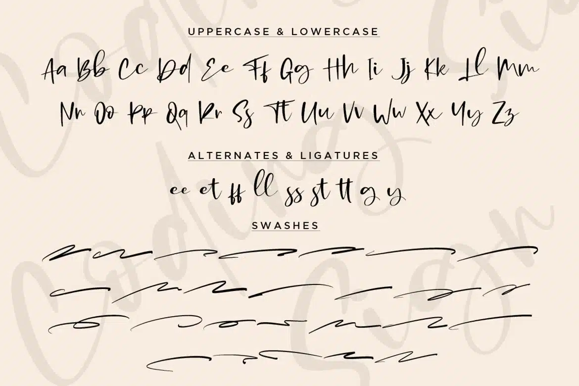 I love using this one with layer masks in Photoshop, really look natural written. Coding Sign Script includes over couple ligatures to make everything look totally hand-done. Also with swashes font for complete your design really make your need. :) You just need install the Coding Sign Swashes and type A-Z or a-z or 0-9 and get the natural swashes font.