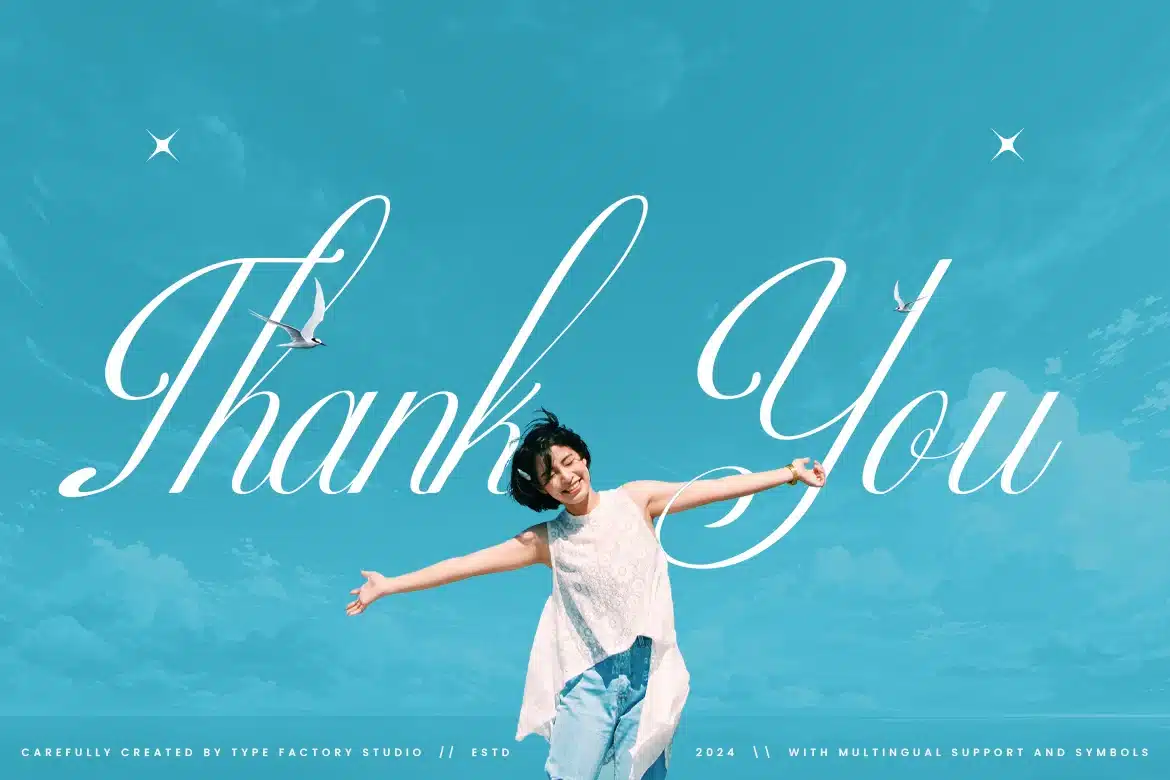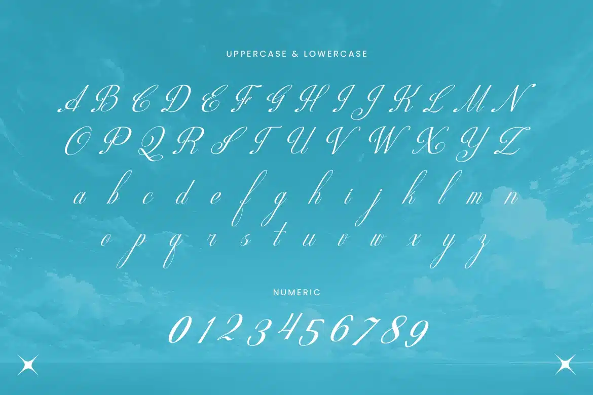 The smooth transitions and delicate contrasts make it ideal for projects that require a personal and artistic touch. Its letterforms are carefully crafted to create natural rhythm and harmony, making it suitable for both short headlines and decorative text compositions.