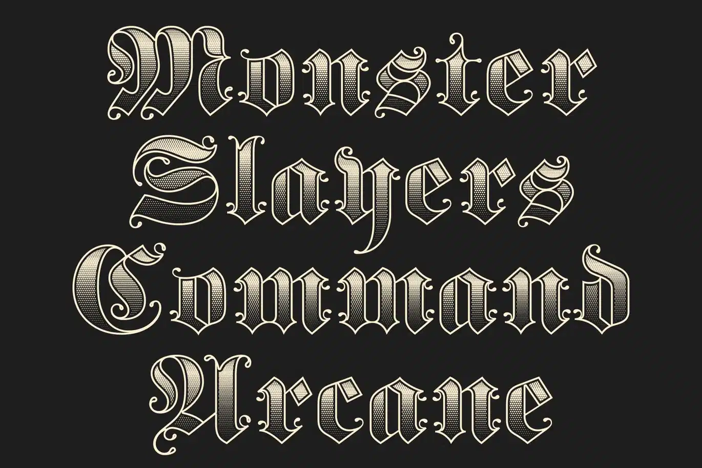 This is a bold blackletter fraktur display font that merges traditional Gothic aesthetics with a striking modern presence. Its sharp angles, dramatic strokes, and strong contrasts embody the authority and artistry of historical lettering. Enhanced with a stippled texture, the font gains a subtle dotted surface that adds depth and a handcrafted engraved feel, reinforcing its rich historical character.