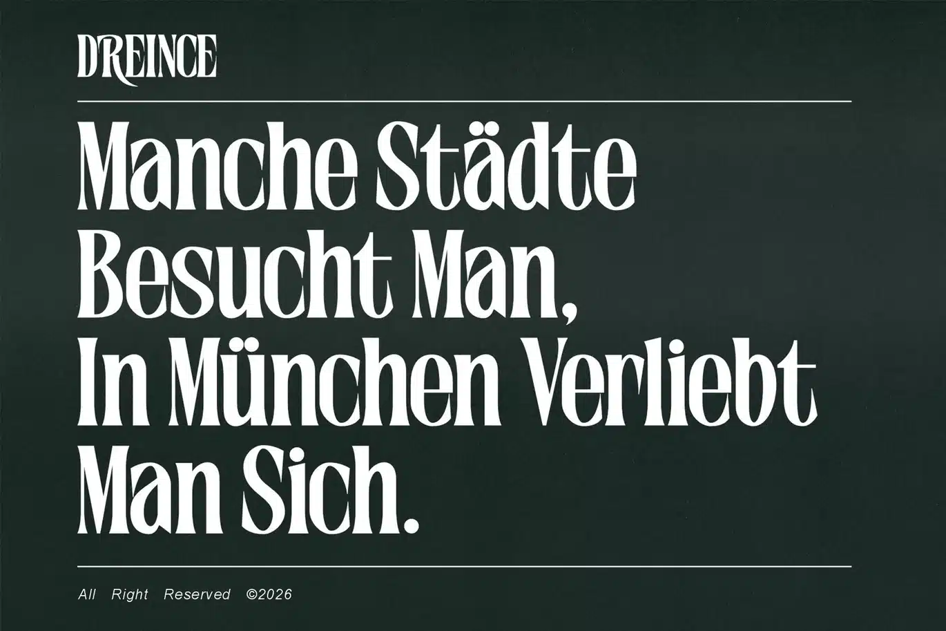 Dreince - Classic Condensed Serif is a striking high-contrast display serif that masterfully blends classical elegance with a sharp, contemporary edge. It features a dramatic interplay between thick, bold stems and razor-thin hairlines, giving it a luxurious and sophisticated presence. It captures a retro-classic aesthetic while maintaining a clean, digital precision, making it highly suitable for luxury logos, poster designs, and artistic headlines. The letterforms are tall and narrow, which creates a rhythmic, vertical emphasis perfect for high-fashion editorial or premium branding.