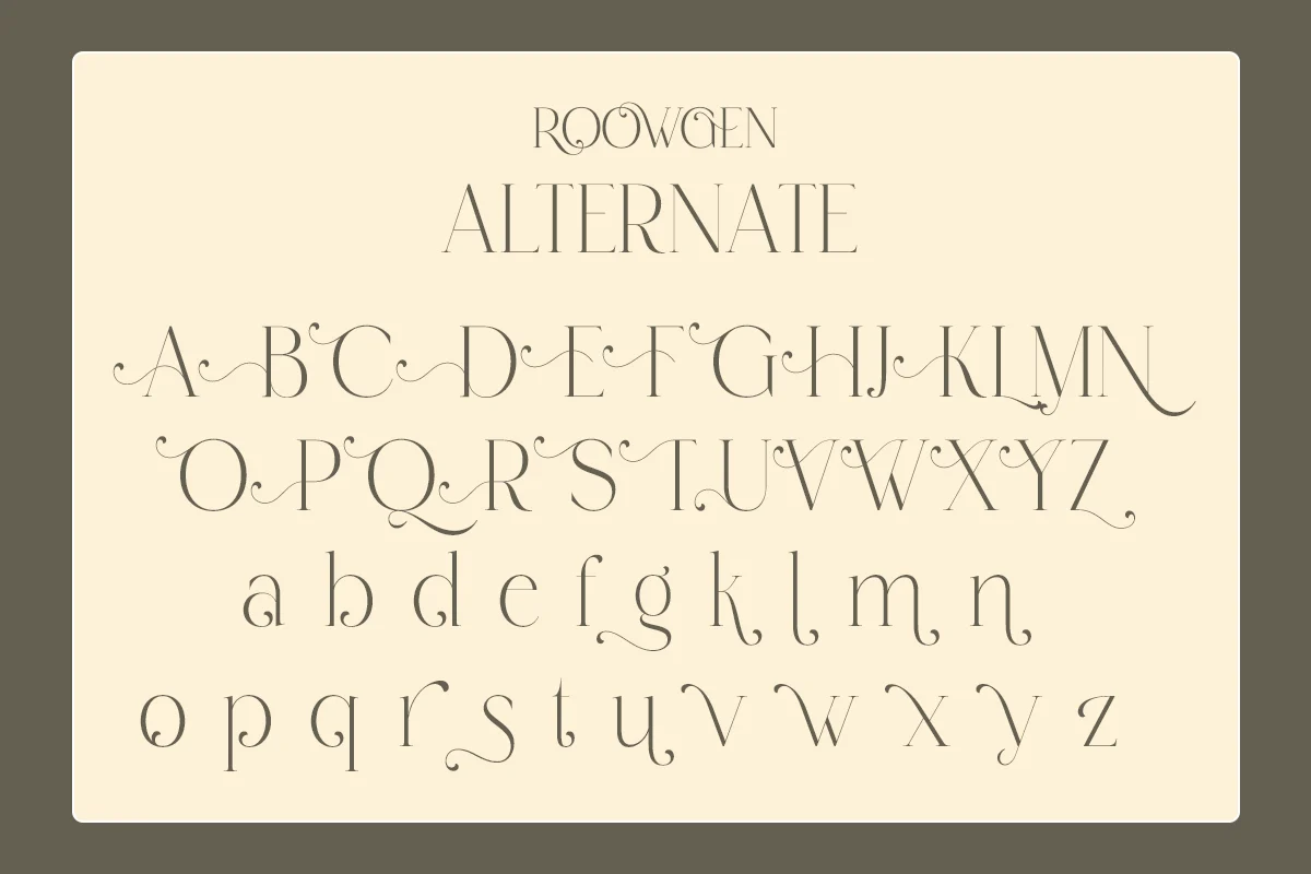 Roowgen is an elegant modern swash serif typeface designed for luxury branding and editorial typography. Featuring graceful curves, refined contrast, and stylish alternates, this font creates a sophisticated and timeless appearance.