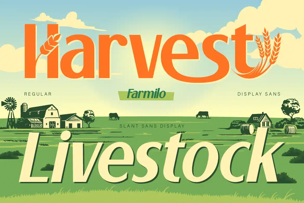 Farmilo comes in two styles: Regular, which is clean, stable, and highly readable, and Slant, which feels more dynamic, stylish, and expressive. This font is perfect for a wide range of projects, especially those related to farm and agriculture branding, organic food packaging, local markets and grocery designs, eco-friendly products, restaurant and café branding, as well as logo design, posters and social media..