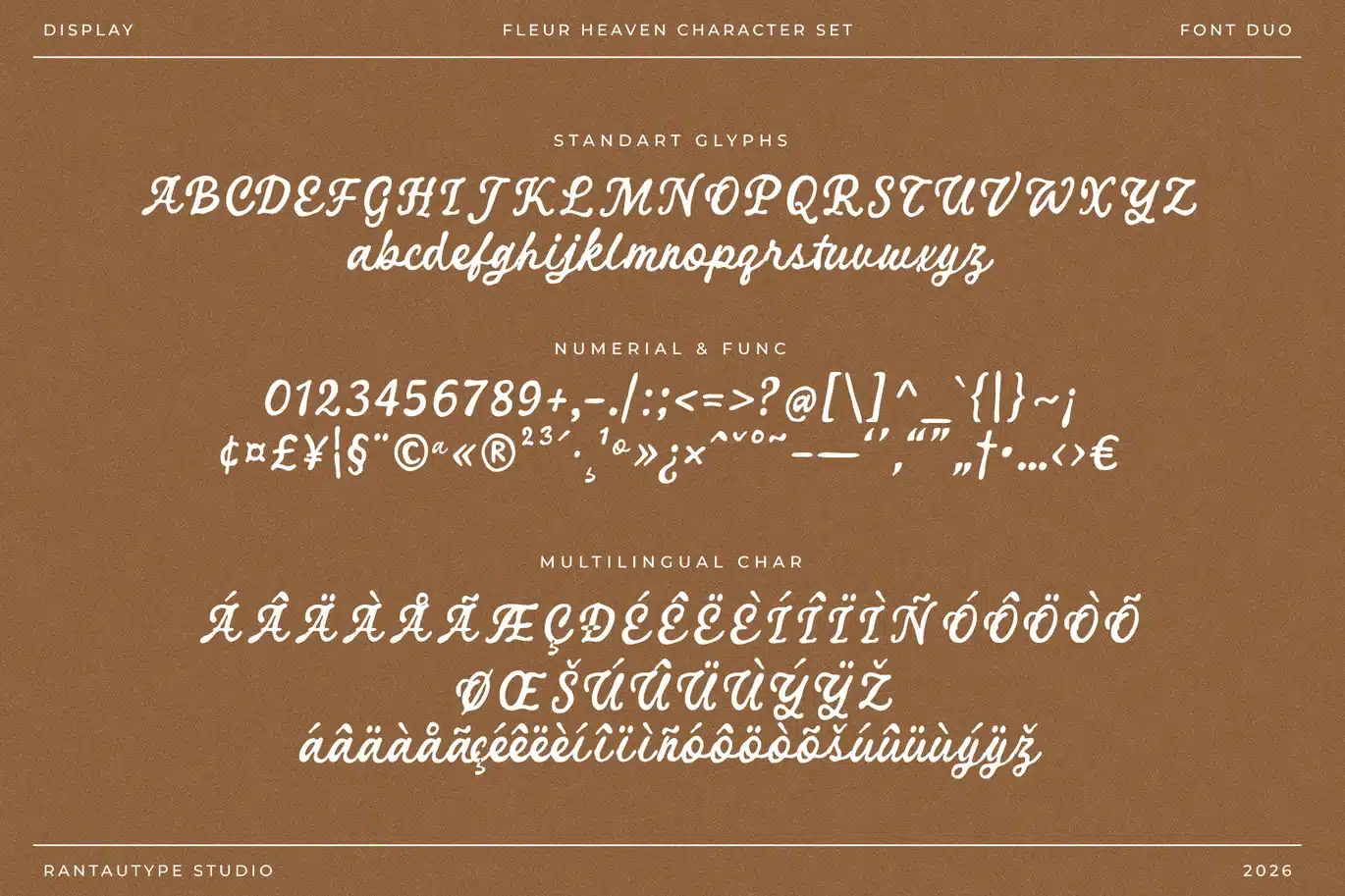 Fleur Heaven is blends sans serif and expressive script with retro display style creates a powerful visual identity that feels both timeless and full of personality. This combination is designed for brands that want to stand out with confidence while maintaining a sense of elegance and readability.
