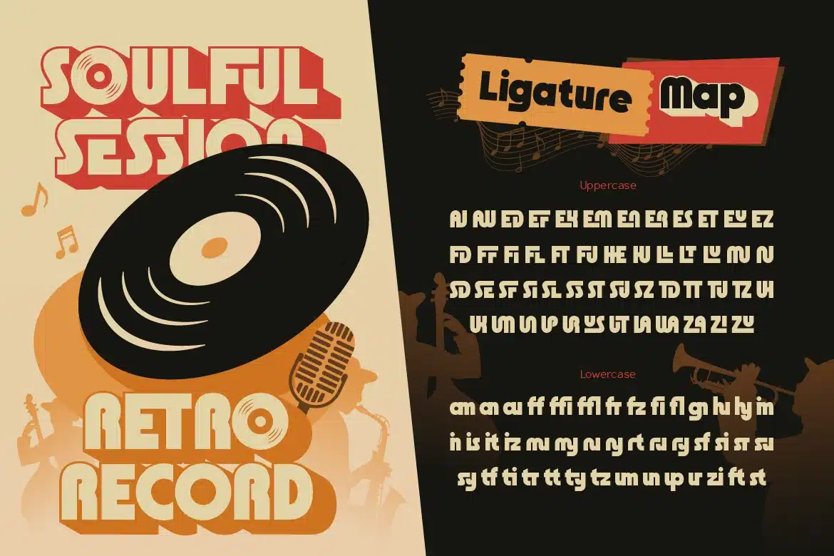 Perfect for designs that want to stand out loud and proud, Funkora is your go to choice for anything music inspired, retro themed, or creatively bold.
