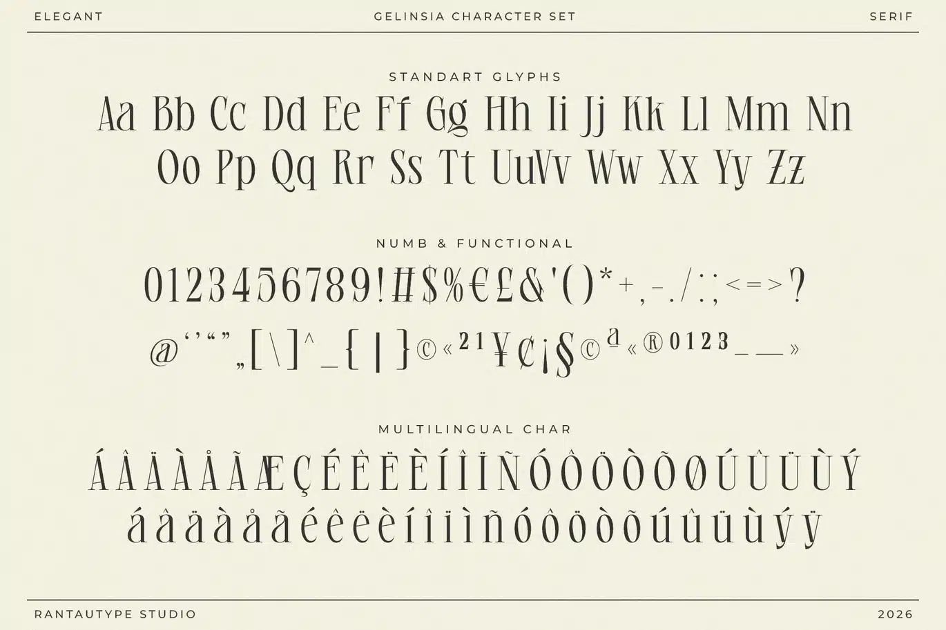 Gelinsia is embodies the perfect fusion of timeless sophistication and contemporary flair. It draws from classical typography, where refined serifs and balanced proportions create a sense of grace, yet it introduces subtle modern touches that make it feel fresh, expressive, and fashion-forward. This harmony between tradition and style allows the font to stand out as both enduring and relevant in today’s design landscape.