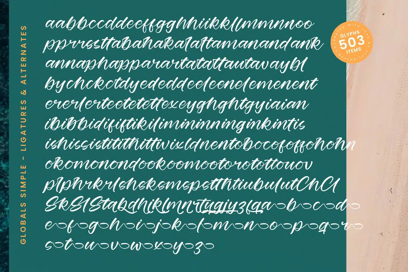 Globals Simple is a bold calligraphy script font designed to bring confidence, elegance, and contemporary energy into design projects. With its bold handwritten strokes, stylish ligatures, and smooth alternates, this font is perfect for modern creatives who want to make a strong impression. Featuring 127 ligatures, 44 alternates, and a total of 503 glyphs, Globals Simple provides endless flexibility for creating expressive and customized lettering compositions.