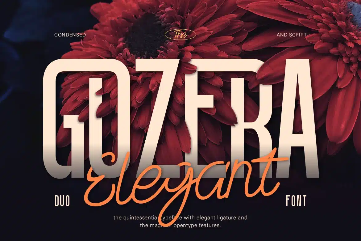Introducing Gozera, a stunning font duo that combines two contrasting yet perfectly balanced styles: a modern condensed sans serif and an elegant handwritten script. This unique pairing gives you the freedom to create bold, dynamic designs with a sophisticated touch.