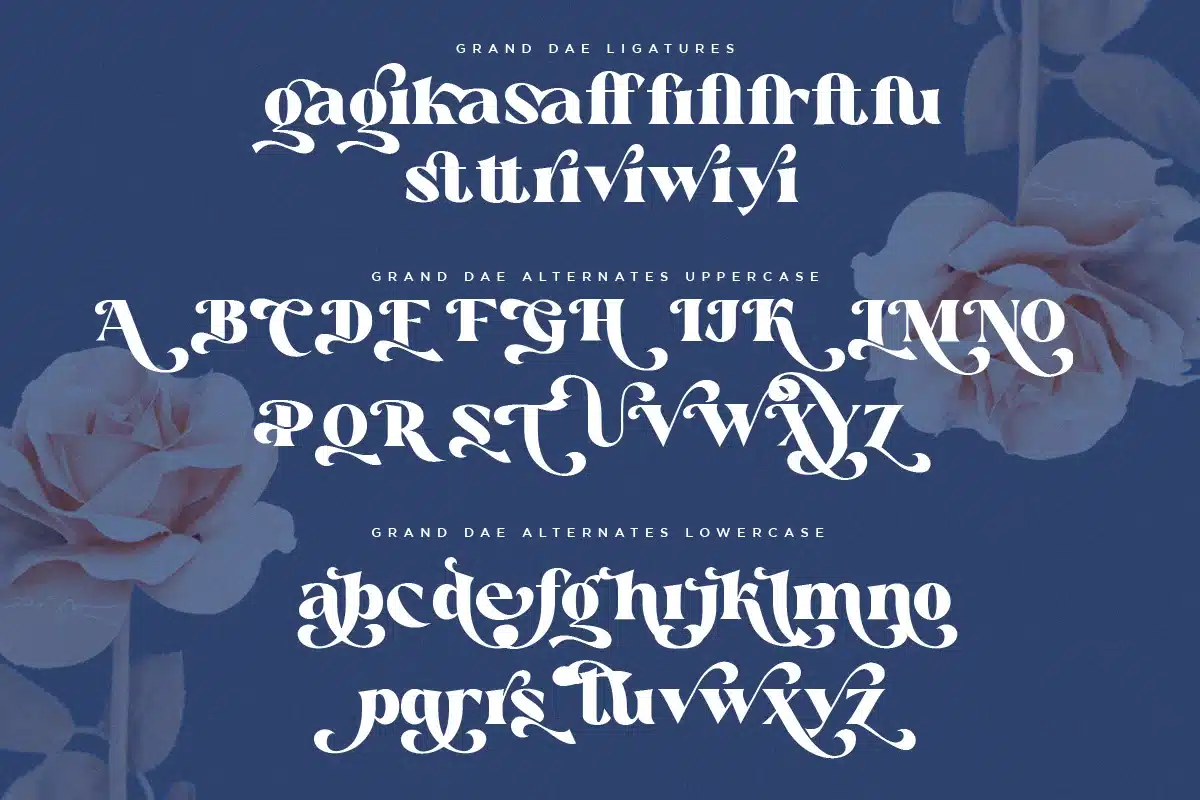 Grand Dae is unique as it can be used for a variety of design styles. It fits in wonderfully for free-spirited, boho designs and also for more classy editorial looks! There are a lot of fun stylistic alternates available to use with this font. These letters are embedded into the font file and easily accessible in programs such as photoshop and illustrator.