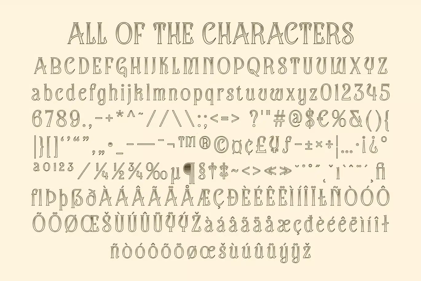 This font works beautifully for high-end branding, vintage-style invitations, editorial headlines, packaging, and artistic layouts. Its combination of elegant serif forms and textured detailing ensures a strong visual presence while maintaining a refined and sophisticated character.