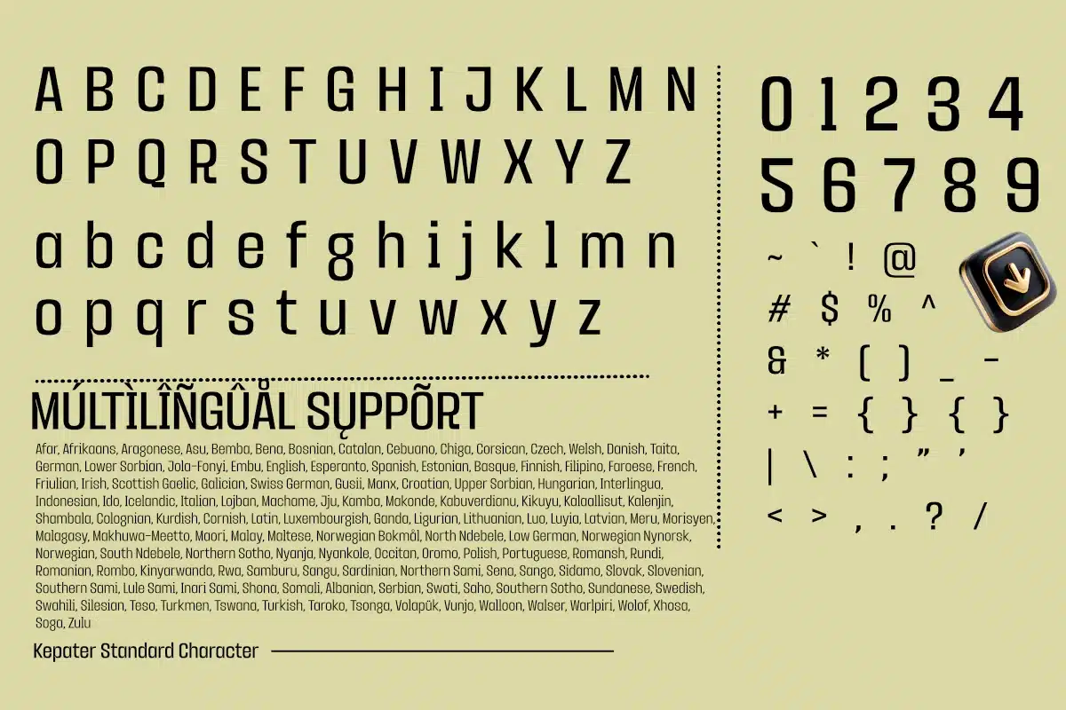 Offering limitless flexibility for designers, Kepater comes equipped with a comprehensive collection of 18 styles, spanning a wide weight spectrum from delicate, elegant Thin to powerful, commanding Blackāall accompanied by dynamic matching Italics. This extensive range makes Kepater a highly versatile typographic solution; it is exceptionally comfortable for long-form body text in documents or digital applications, while remaining incredibly impactful for headlines, product branding, and logo design. Kepater is the intelligent choice for creating a professional and harmonious visual hierarchy in any design project.