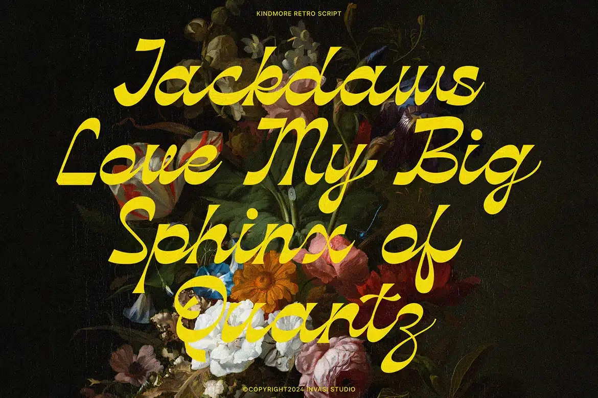 Elevate your design game with Kindmore, a captivating script font boasting a reverse classic vintage style. Whether you're diving into retro vibes or exploring diverse design themes, Kindmore's versatility has you covered. Meticulously crafted, its alternates and ligatures add an extra layer of intrigue to your projects, while intentional imperfections maintain a casual charm without compromising legibility. Ideal for headlines, flyers, posters, greeting cards, product packaging, book covers, logotypes, and album covers, Kindmore is your go-to font for making a lasting impression. Give your creations the flair they deserve – embrace Kindmore today!