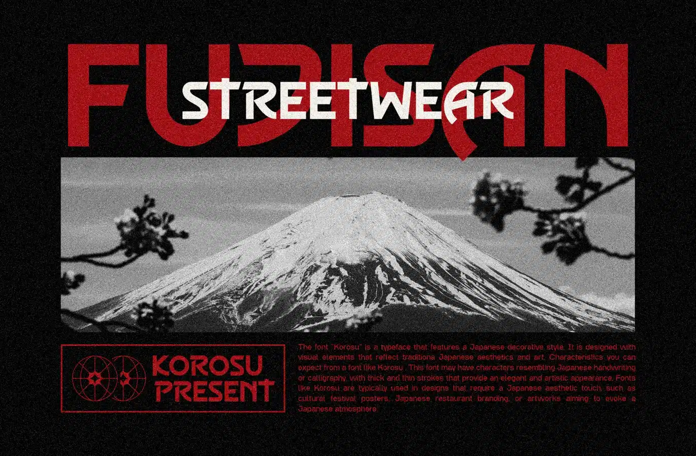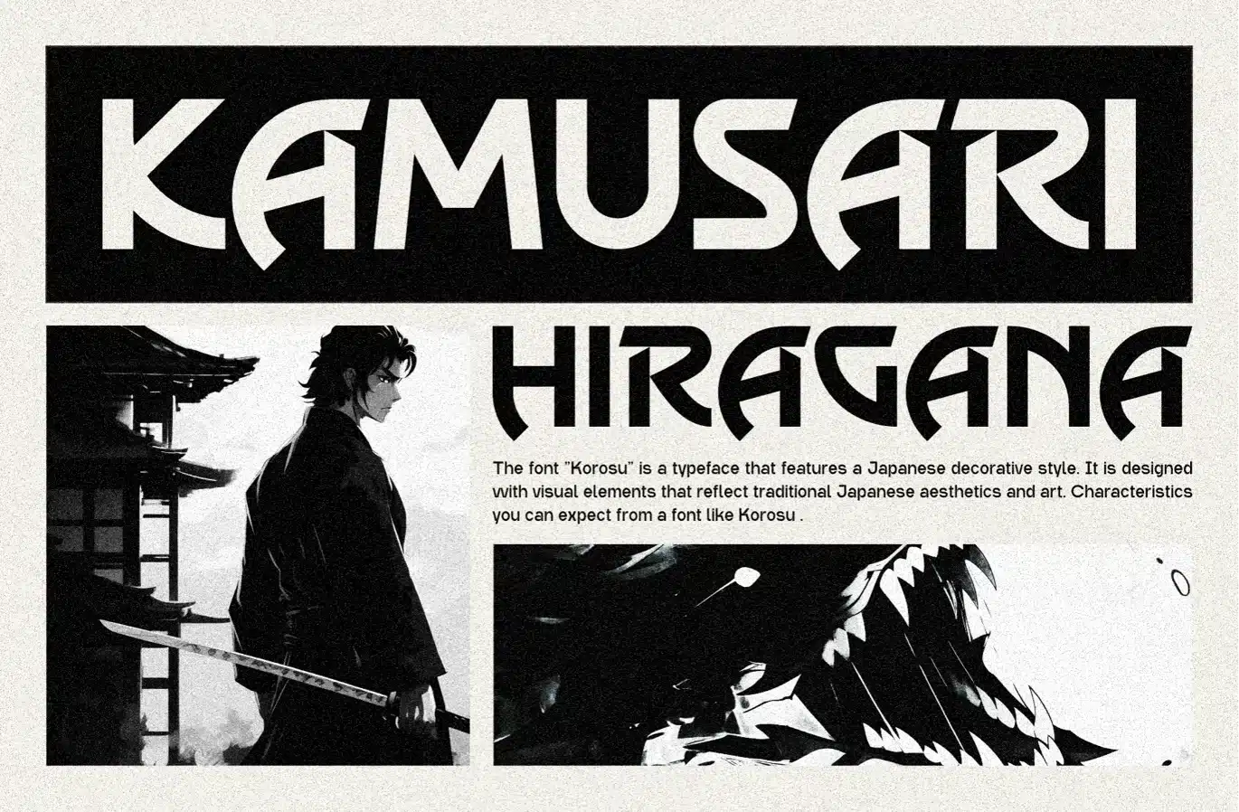 The font Korosu is a typeface that features a Japanese decorative style. It is designed with visual elements that reflect traditional Japanese aesthetics and art. Characteristics you can expect from a font like Korosu , This font may have characters resembling Japanese handwriting or calligraphy, with thick and thin strokes that provide an elegant and artistic appearance, Fonts like Korosu are typically used in designs that require a Japanese aesthetic touch, such as cultural festival posters, Japanese restaurant branding, or artworks aiming to evoke a Japanese atmosphere.