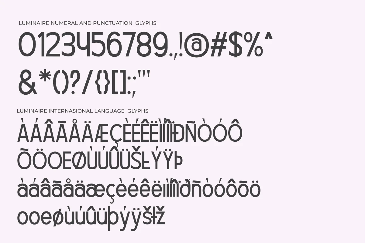 Luminaire is a sleek and modern sans-serif display font featuring clean lines, minimalist styling, and a standout alternate display variant. Designed for maximum versatility, it delivers a professional and contemporary look that works beautifully in logos, branding, magazine covers, headlines, and editorial layouts. The alternate style adds a unique artistic touch while retaining clarity and readability for both bold display and refined layout use.