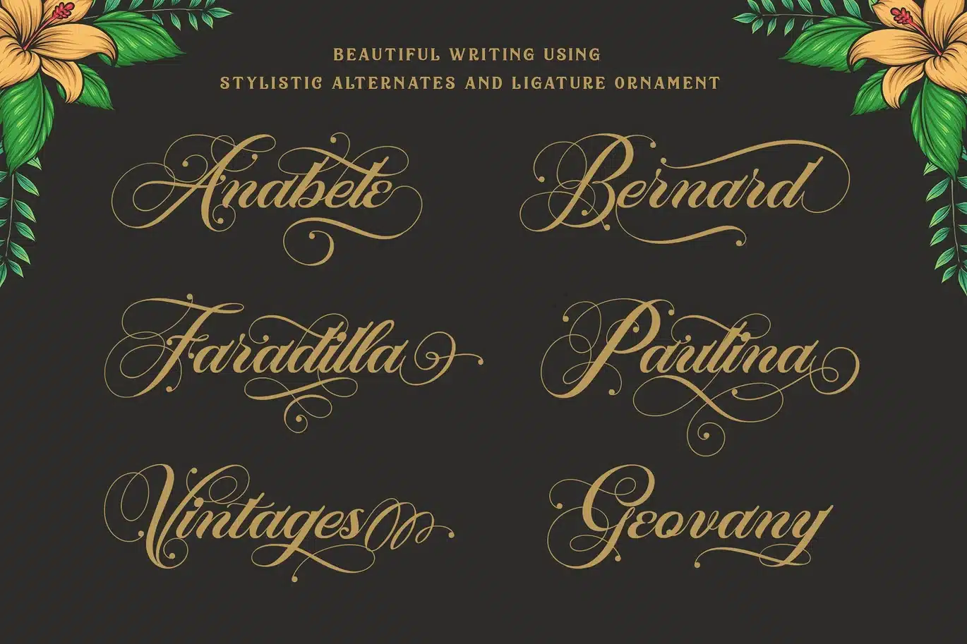 Of course this font has multilingual suport (Afrikaans Albanian, Catalan, Croatian, Czech, Dutch, English, Estonian, Finnish, German, Hungarian, Italian, Polish, Portugese, Slovak, Slovenian, Spanisch, Swedish, Zulu) I also give you a flower illustration bonus that you can use to beautify when you use this font, available EPS and PNG files. This font is very suitable in use for wedding invitations, logotype, badge, branding, packing, etc