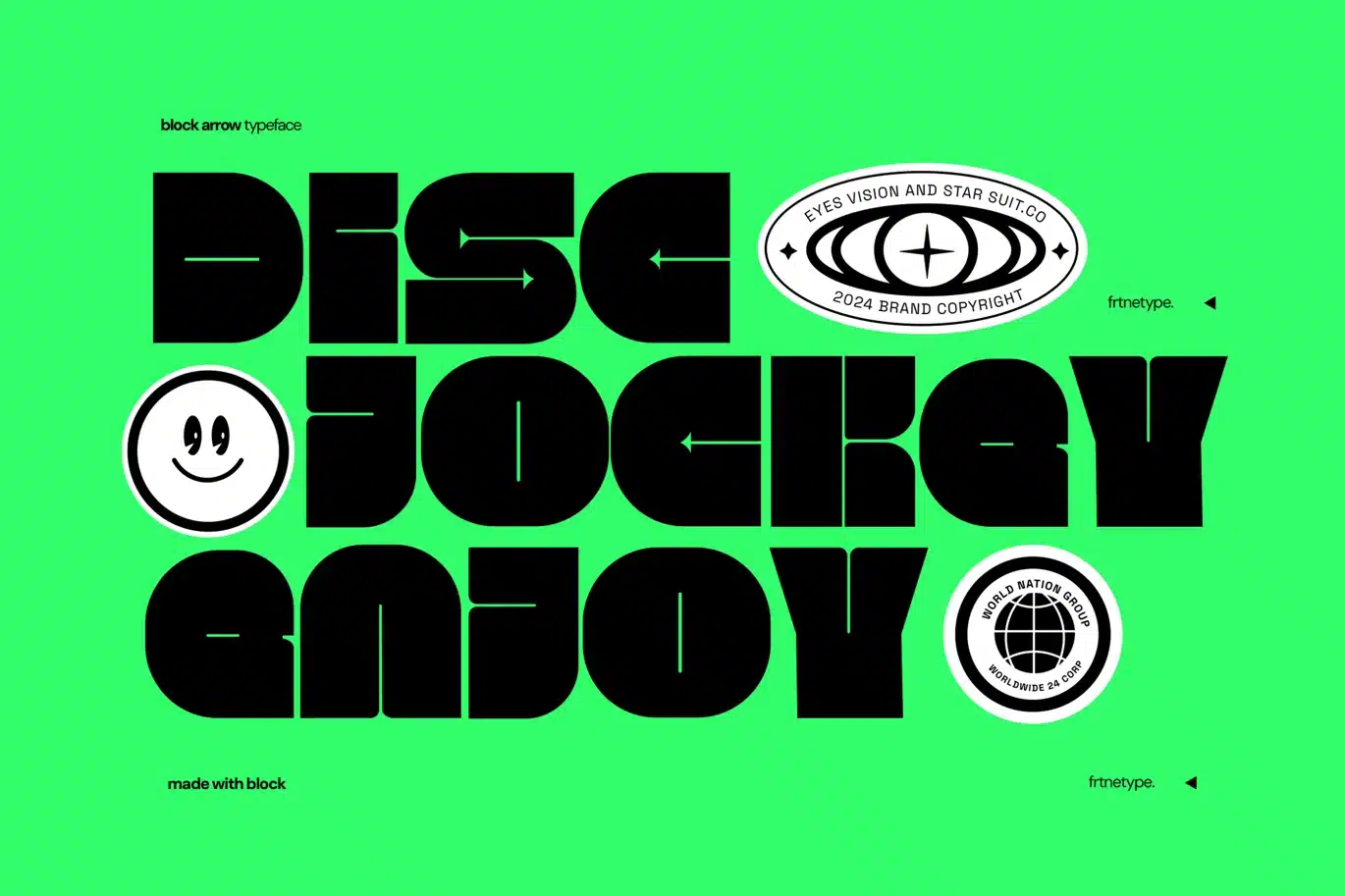 A block funny font is a playful and bold typeface designed to bring a sense of fun and whimsy to any text combined with arrow shape. Characterized by thick, chunky letters with exaggerated proportions, it often features quirky elements such as uneven shapes, rounded edges, or unexpected twists. Its eye-catching and friendly appearance makes it ideal for grabbing attention and adding a dash of humor to designs, creating an inviting and cheerful atmosphere.