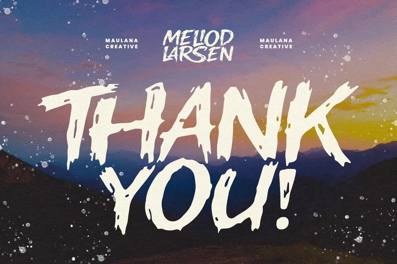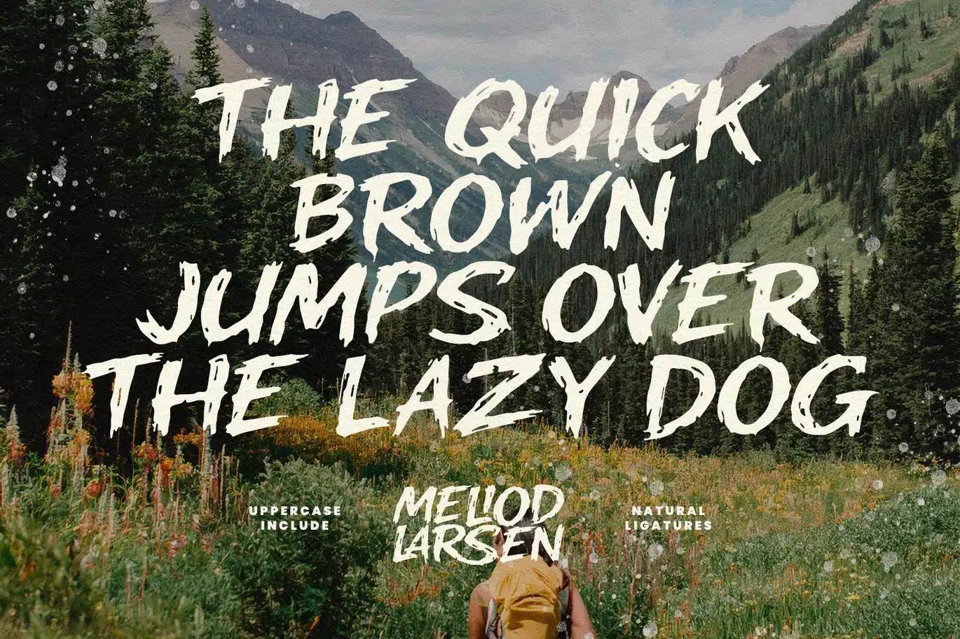 Bring your forest stories to life with Meliod Larsen, a font that speaks the language of adventure. This bold and gritty hand-drawn display font is designed for those who want to capture the raw, untamed essence of nature and the outdoors. Featuring a rugged texture and natural ligatures, it is perfect for branding, camping gear, mountain-themed designs, and travel posters. Meliod Larsen includes uppercase characters and full multilingual support to ensure your message reaches every corner of the wild.
