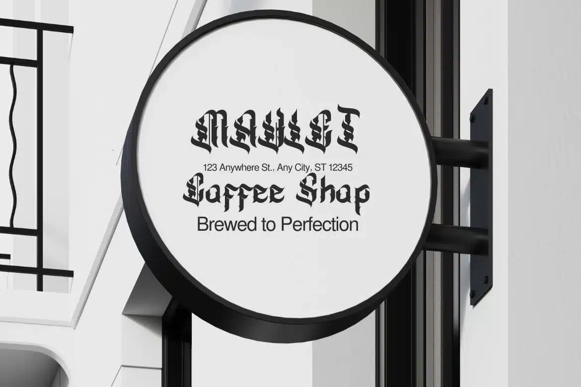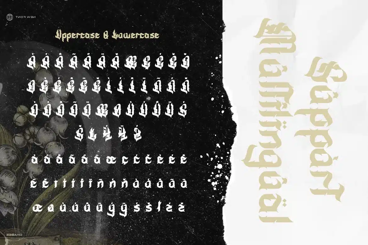 Meviat Gothic - Gothic Blackletter Font is a bold blackletter fraktur display font that merges traditional Gothic aesthetics with modern impact. Its intricate letterforms feature sharp angles, dramatic strokes, and striking contrasts, embodying strength, authority, and historical charm. The bold weight enhances its commanding presence, making it ideal for designs that demand attention and sophistication