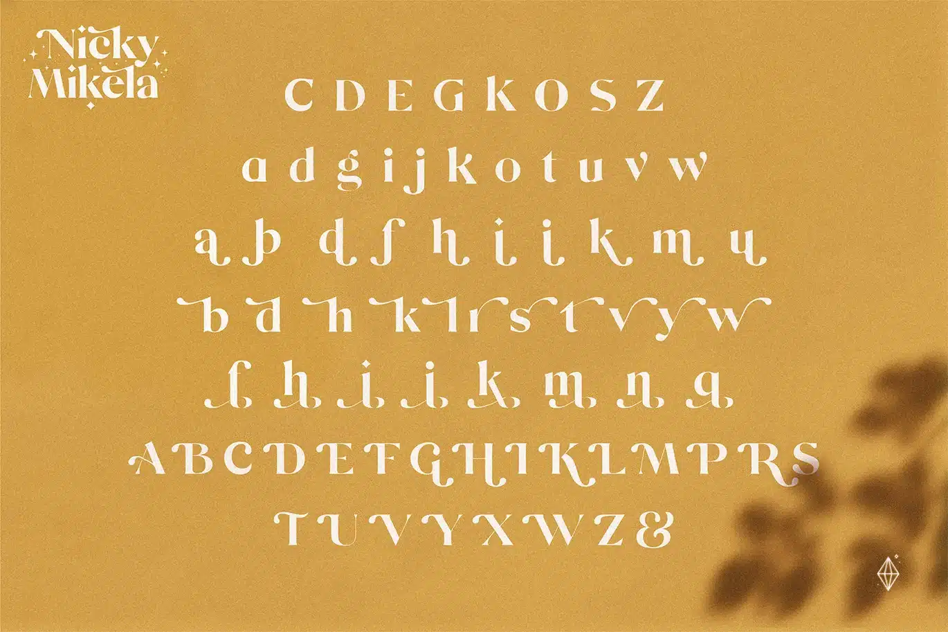 Nicky Mikela Regular is a Original version of Mikela Minimalist Elegant Modern vintage font with beautiful ligatures, tons of special alternative glyphs, ornament and multilingual support. It's a very versatile font that works great in large and small sizes. Perfect for branding projects, Logo design, Clothing Branding, product packaging, magazine headers, or simply as a stylish text overlay to any background image.