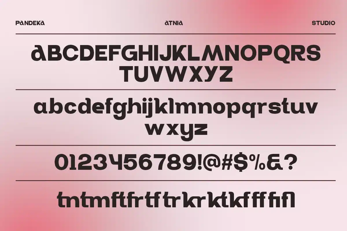 This font comes in 1 style: Regular — featuring uppercase, lowercase, numerals, punctuation, and 7+ unique ligatures to add variety and flair to your typography. Perfect for logos, posters, web design, and social media content, Atnia delivers a refined and timeless modern look.