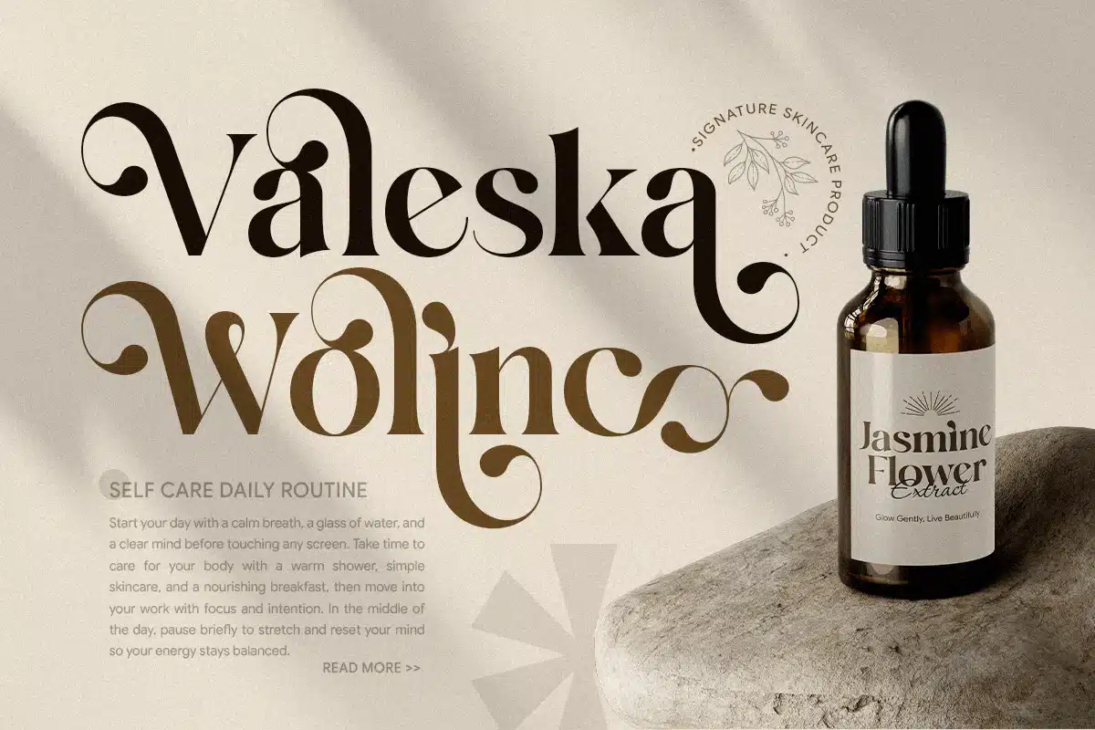 Blending classic serif elegance with a modern feminine touch, Moline delivers excellent readability while maintaining a soft and stylish character. Its graceful appearance makes it ideal for boutique brands, cosmetics, jewelry, lifestyle products, and designers seeking an elegant serif font for refined visual identity.