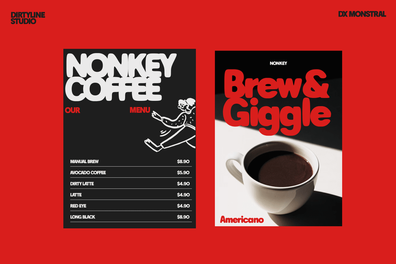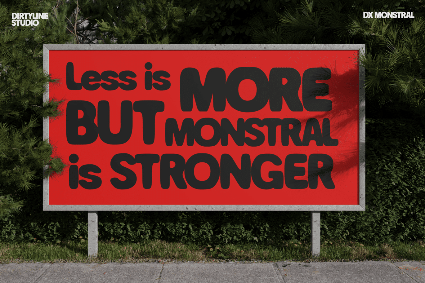 Dx Monstral blends brutal weight with friendly curves. The family delivers three statement styles—perfect for posters, packaging, menus, billboards, apparel graphics, and modern logotypes.