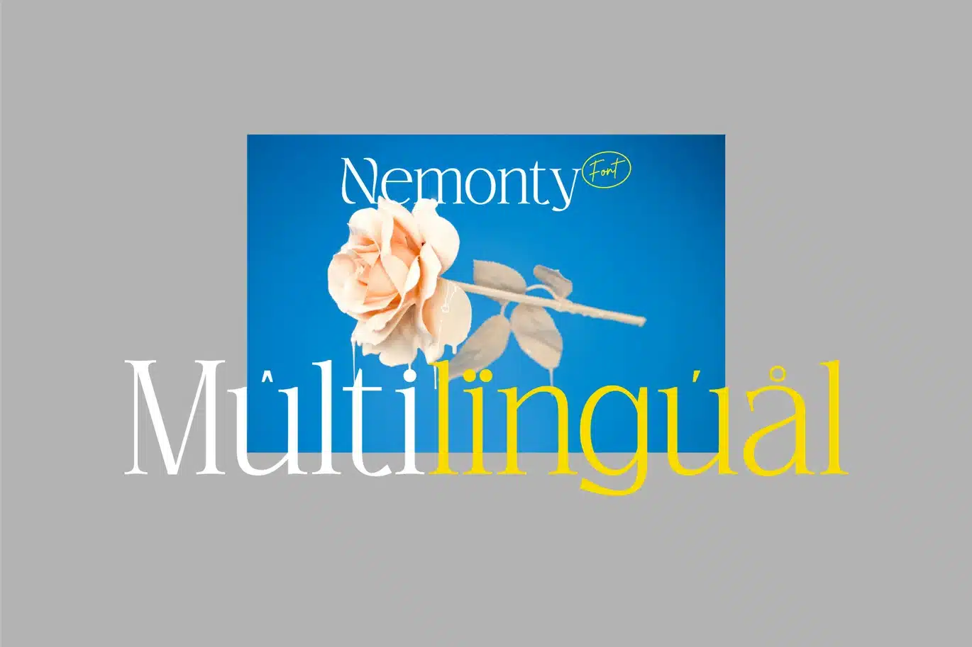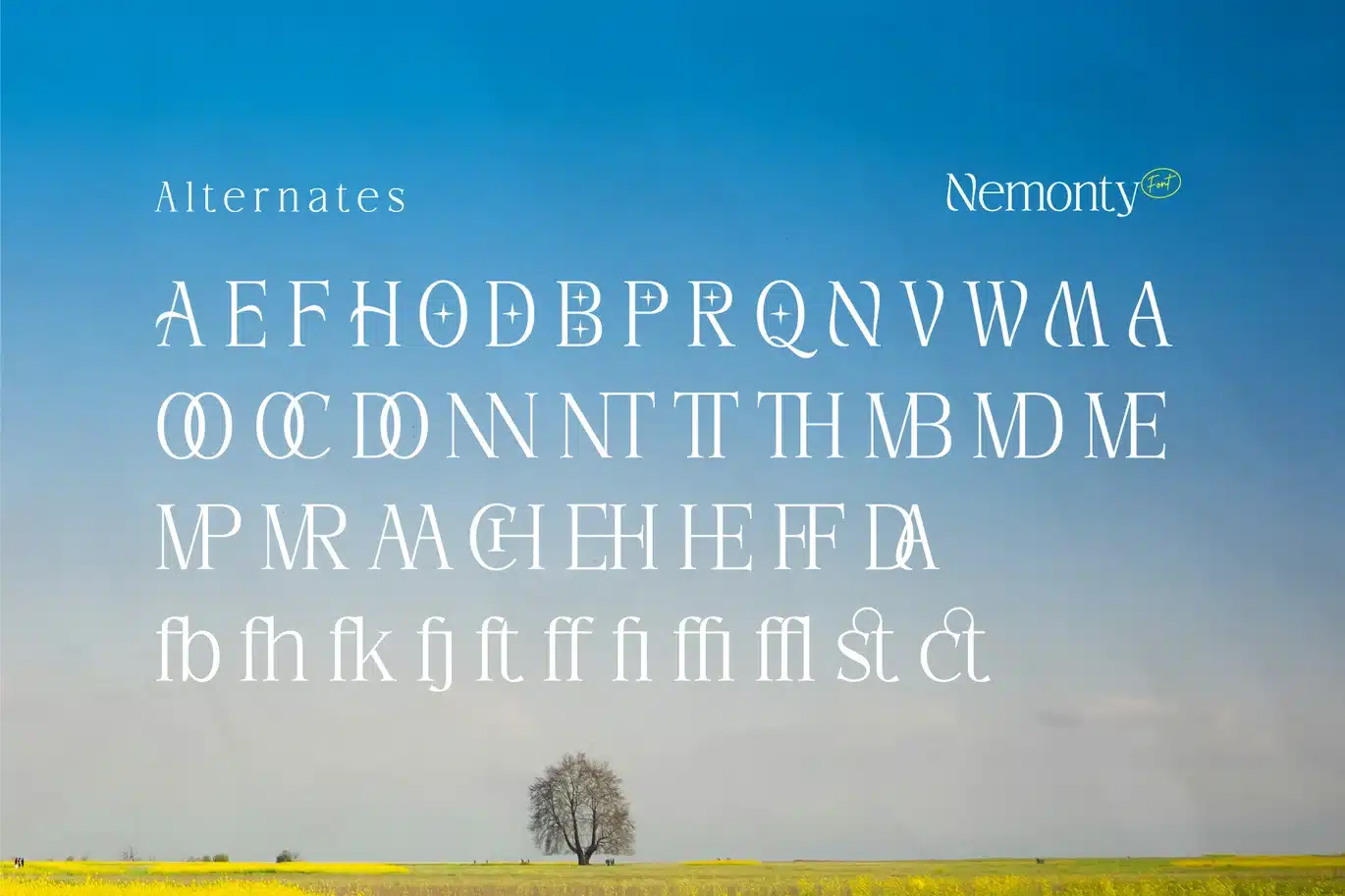 Nemonty includes a range of alternates, providing creative flexibility for custom wordmarks and unique logo designs. Ideal for luxury branding, packaging and editorial use, this font’s versatility and elegant style make it a must for designers looking to achieve a sleek and professional aesthetic. Make your projects stand out with the modern, minimalist Nemonty font