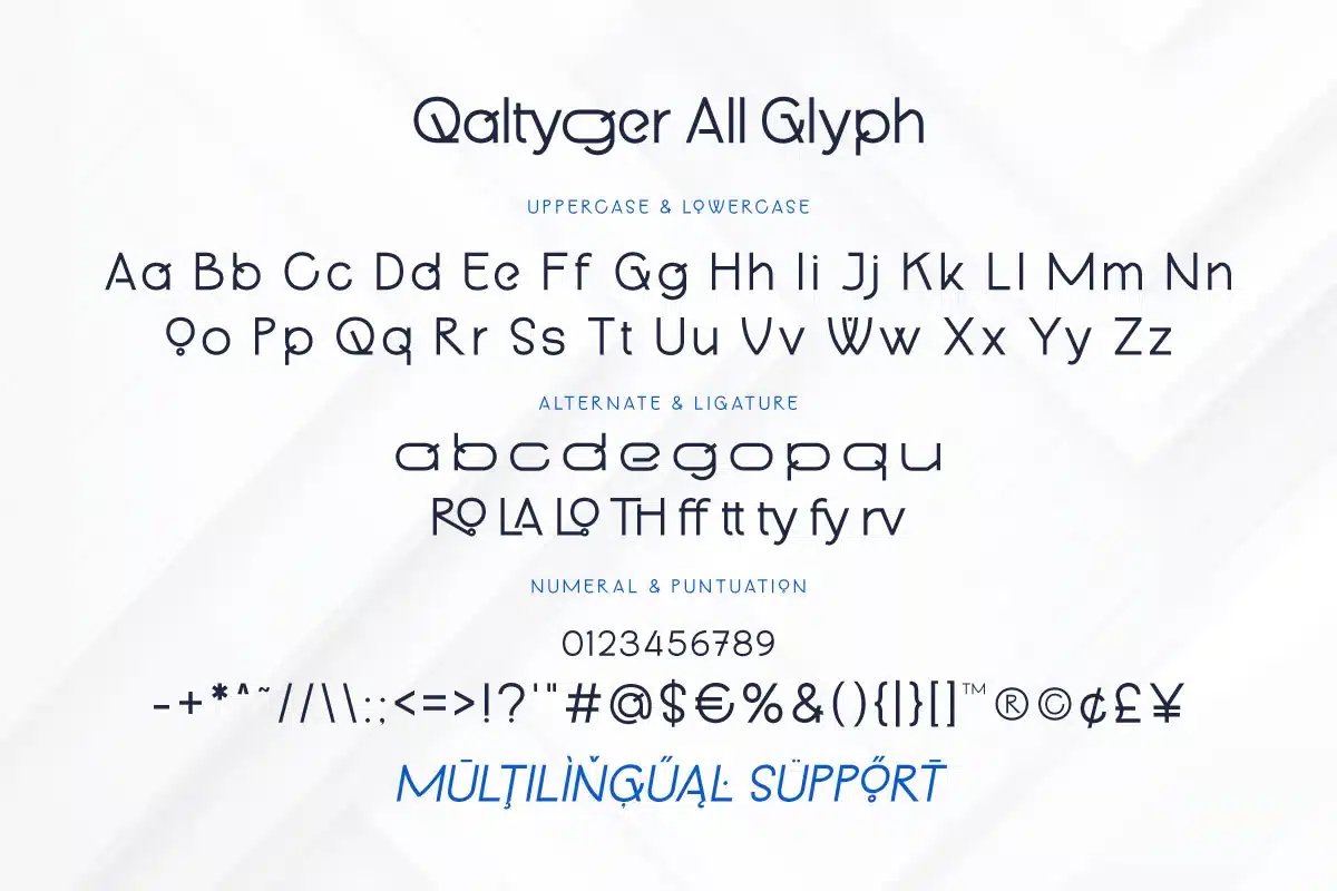 Featuring uppercase, lowercase, numerals, punctuation, and multilingual support, Qaltyger ensures your brand speaks clearly and stylishly to a global audience.