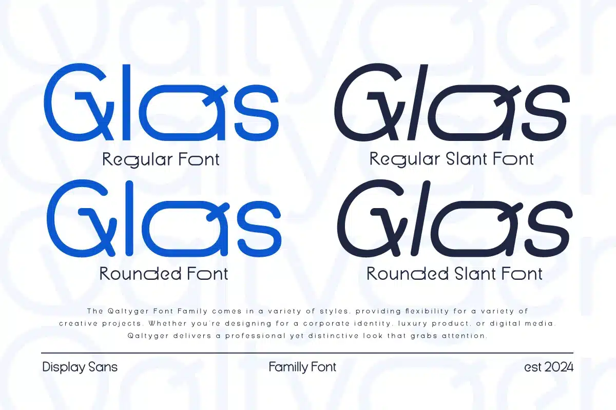 Available in Regular, Rounded, Regular Slant, and Rounded Slant styles, this font gives you flexibility to adapt across different branding needs. From corporate logos and startup identities to packaging, posters, and digital media, Qaltyger delivers a strong yet refined visual presence.