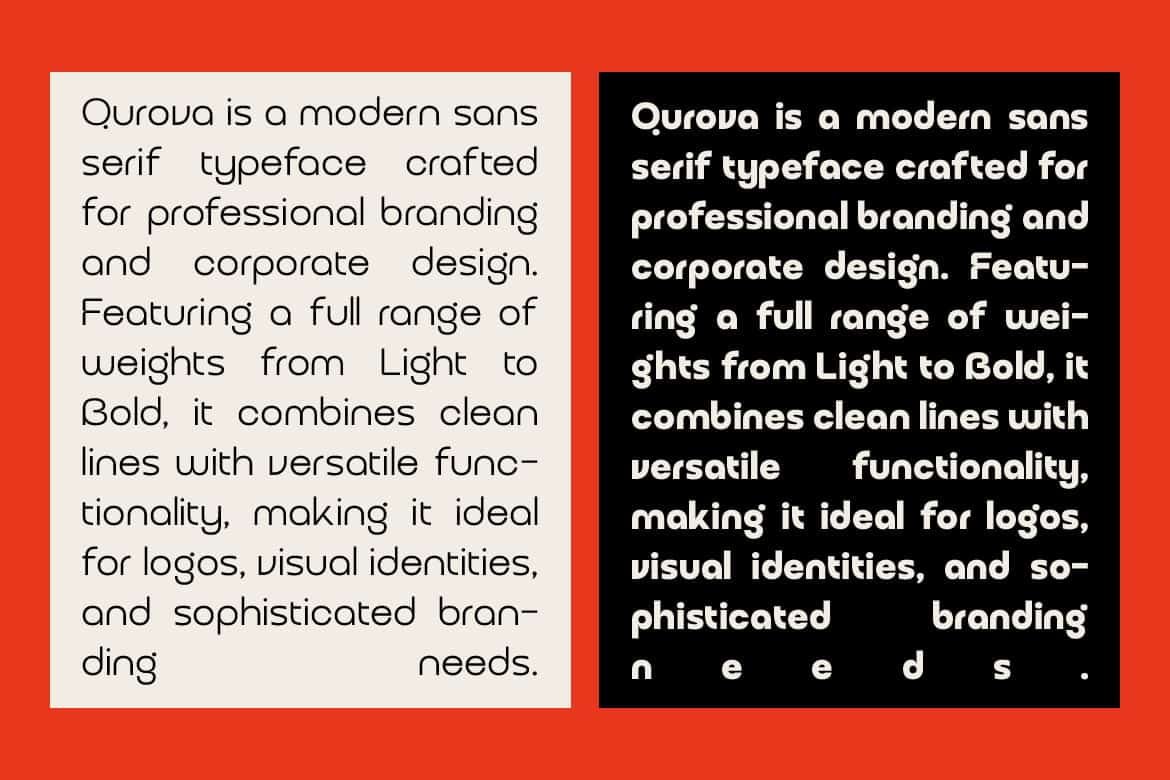 Qurova is a modern sans-serif typeface crafted for professional branding and corporate design. Featuring a full range of weights from Thin to Bold, it combines clean lines with versatile functionality, making it ideal for logos, visual identities, and sophisticated branding needs.