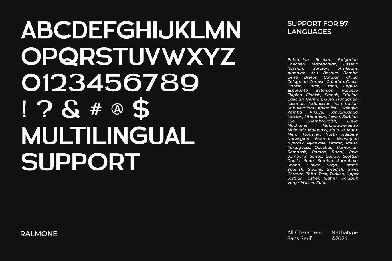 Ralmone is a modern luxury versatile sans serif font family designed to offer a wide range of typographic possibilities. Crafted exclusively in uppercase, Ralmone exudes a sense of modernity and strength. With seven font weight choices available, ranging from Thin to Bold, Ralmone provides designers with the flexibility to create impactful compositions.