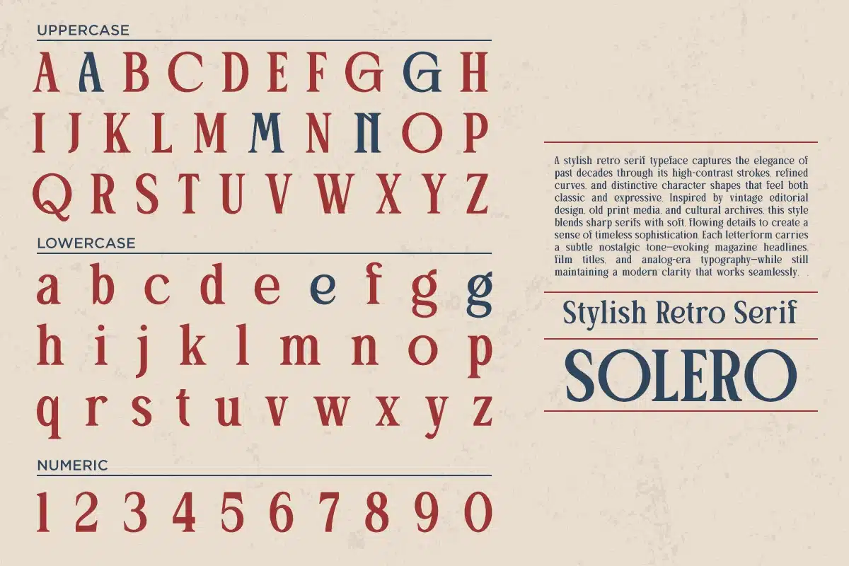 Designed for creators who want to capture attention with authenticity, Solero works beautifully across branding, logos, packaging, posters, and editorial layouts. Whether you're building a fashion identity, crafting a retro-themed project, or designing standout headlines, this font brings a perfect balance between sophistication and nostalgic charm.