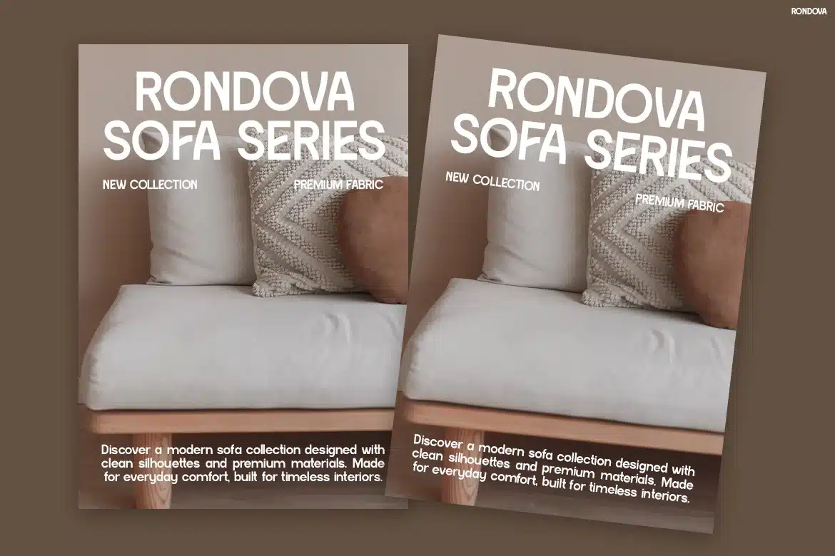 Built for designers working in interior, furniture, and lifestyle markets, RONDOVA brings a composed and stylish tone to every layout. Whether you're crafting branding systems, editorial spreads, posters, or app UI visuals, this typeface supports a cohesive and modern identity. It helps communicate a sense of calm, order, and visual harmony—ideal for brands aiming to appear refined, contemporary, and approachable.