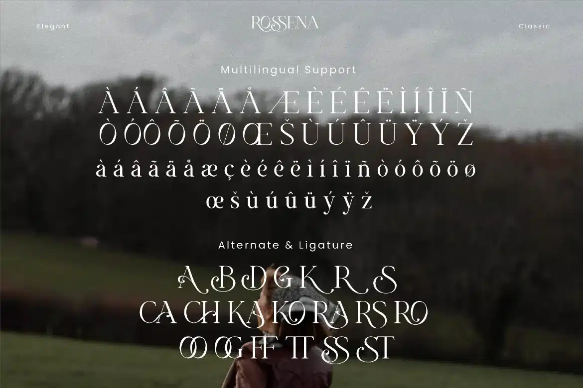 Rossena is a modern retro serif font that features unique alternate and ligature characters. Its stylish design is perfect for creating a classic and contemporary feel in your projects. With support for multiple languages, Rossena is ideal for headlines, logos, and other branding materials.