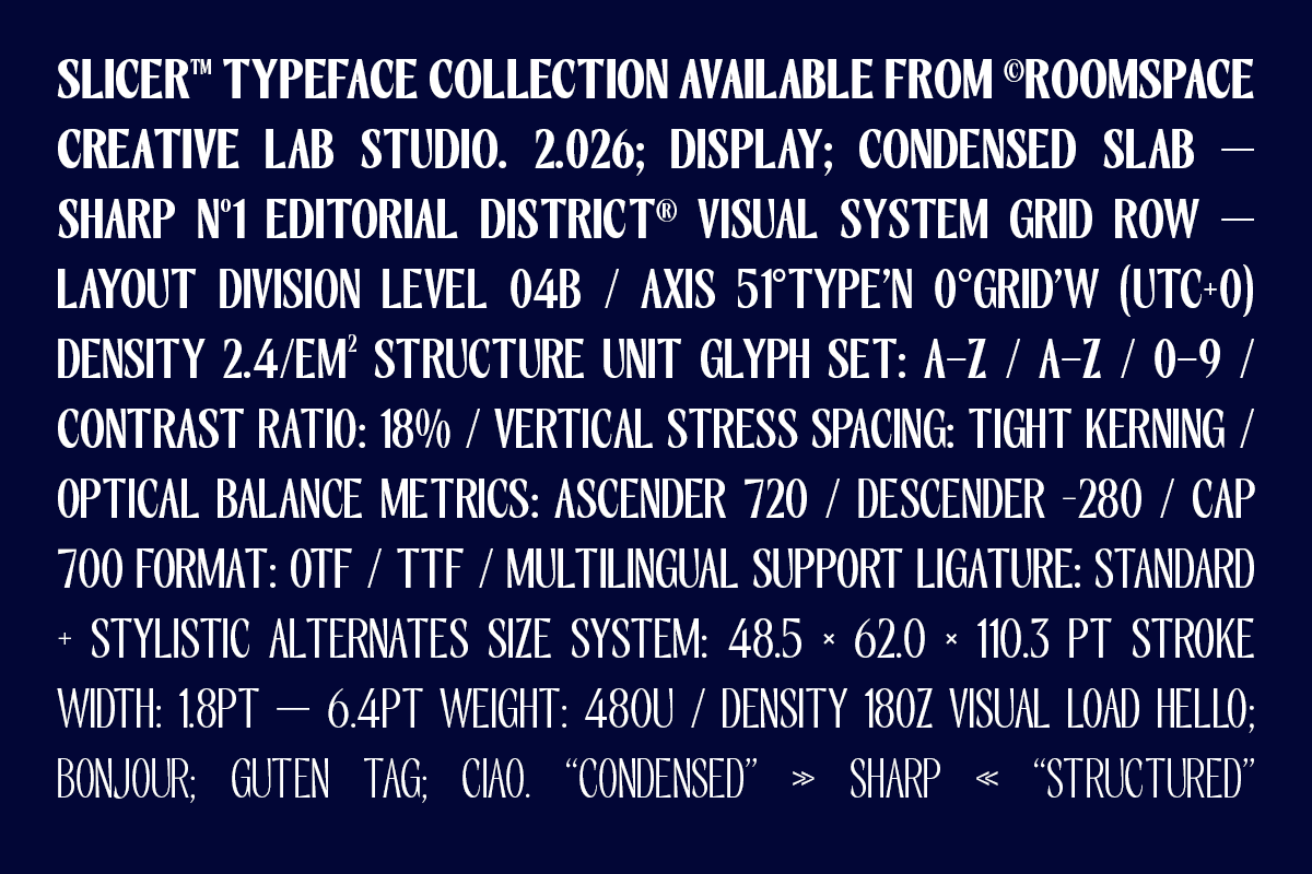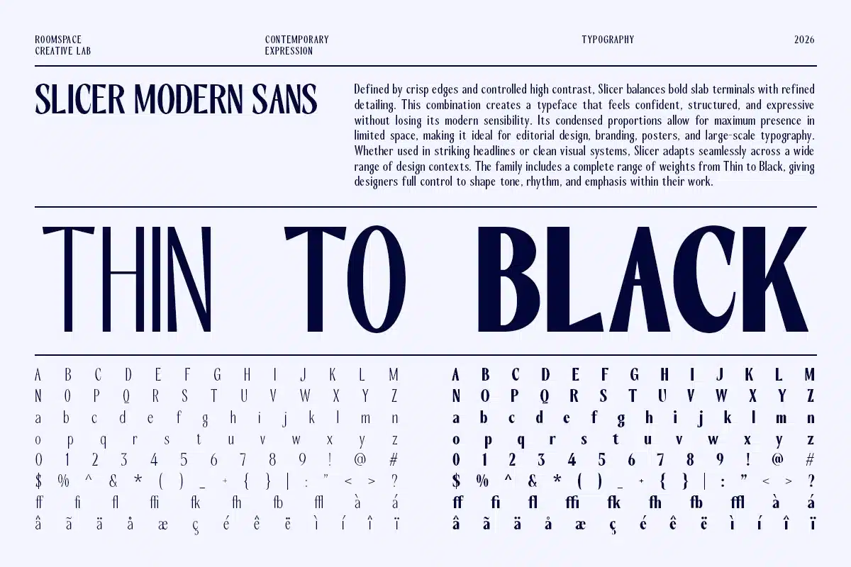 Slicer is a modern condensed sans-serif font family designed for clarity, structure, and strong visual impact. Built with high contrast and tight proportions, it delivers a confident tone for contemporary design systems. With 18 fonts across 9 weights, Slicer gives designers full control over hierarchy, spacing, and visual rhythm. Ideal for branding, editorial layouts, posters, and digital interfaces where space efficiency meets bold expression.