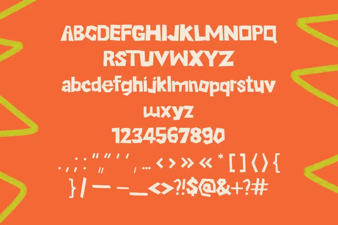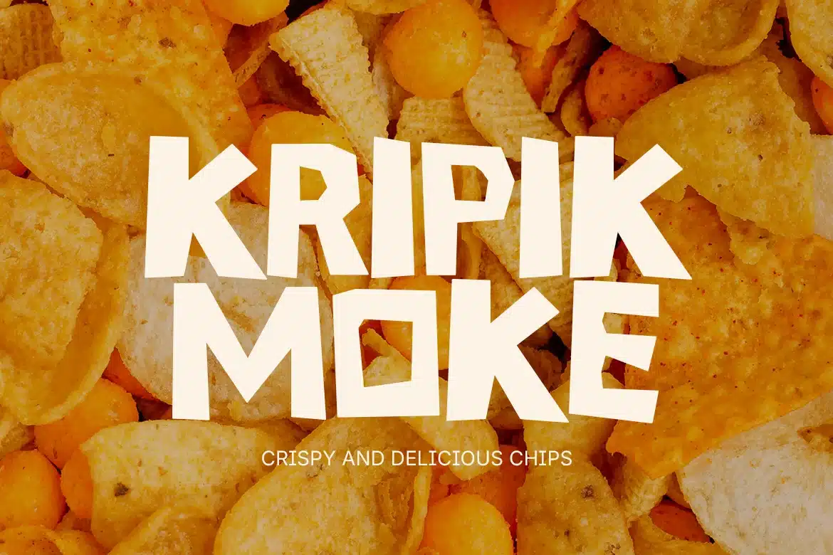 A bold and chunky display typeface characterized by its irregular, hand-cut geometric shapes. The letterforms exhibit a heavy weight with sharp, angular terminals and uneven stroke widths, creating a playful and energetic rhythm. Its blocky construction lacks traditional serifs, instead opting for a raw, paper-cut aesthetic that feels tactile and organic. This font is specifically designed for high-impact visual communication in the food and beverage industry, making it ideal for packaging, menus, and vibrant social media branding where a fun, artisanal personality is required.